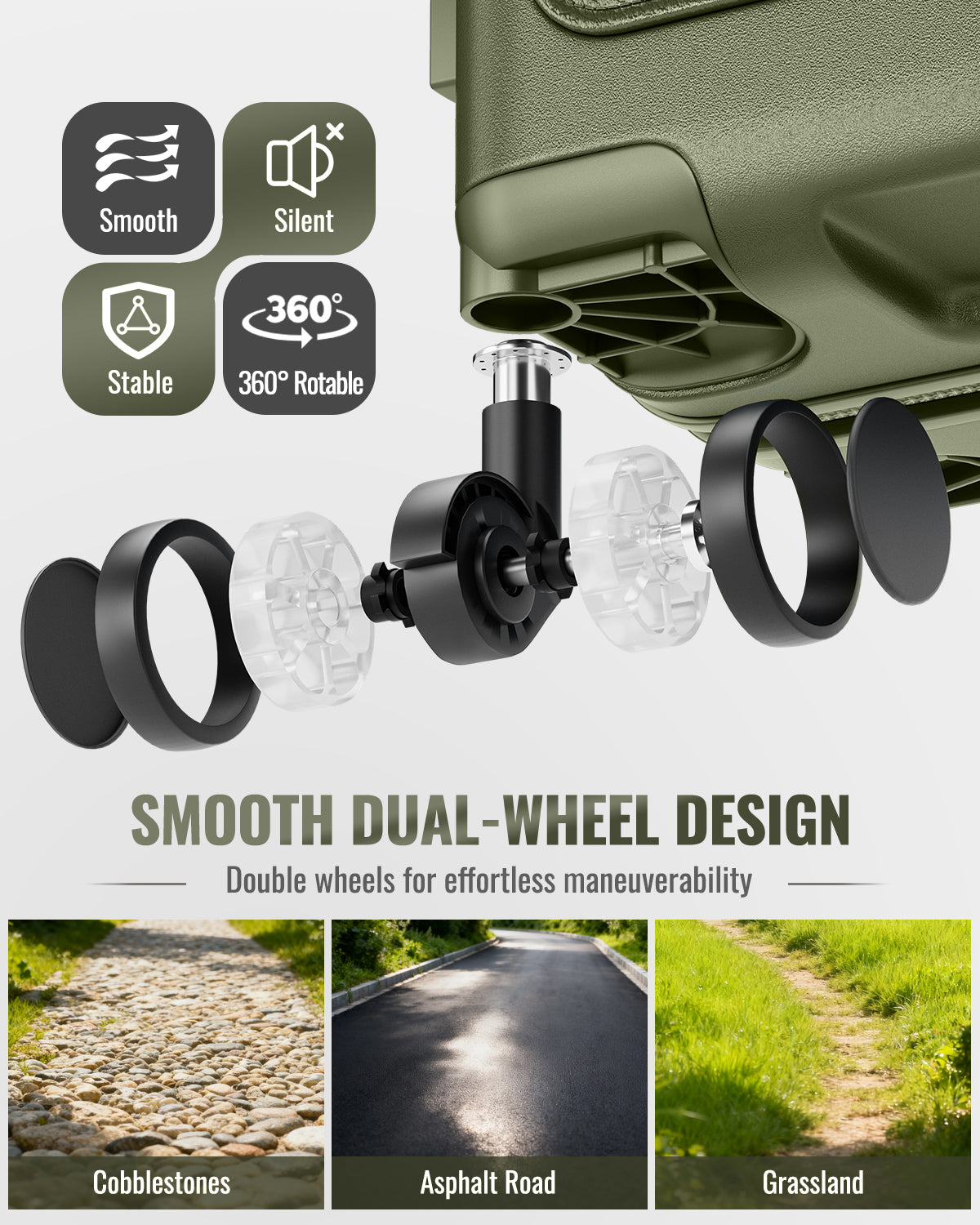 - Quiet Spinner Wheel: Suitcase sets with spinner wheels use high flat and straight shock-absorbing universal wheels to make their travel luggage sets quieter and smoother, ensuring 360° free rotation